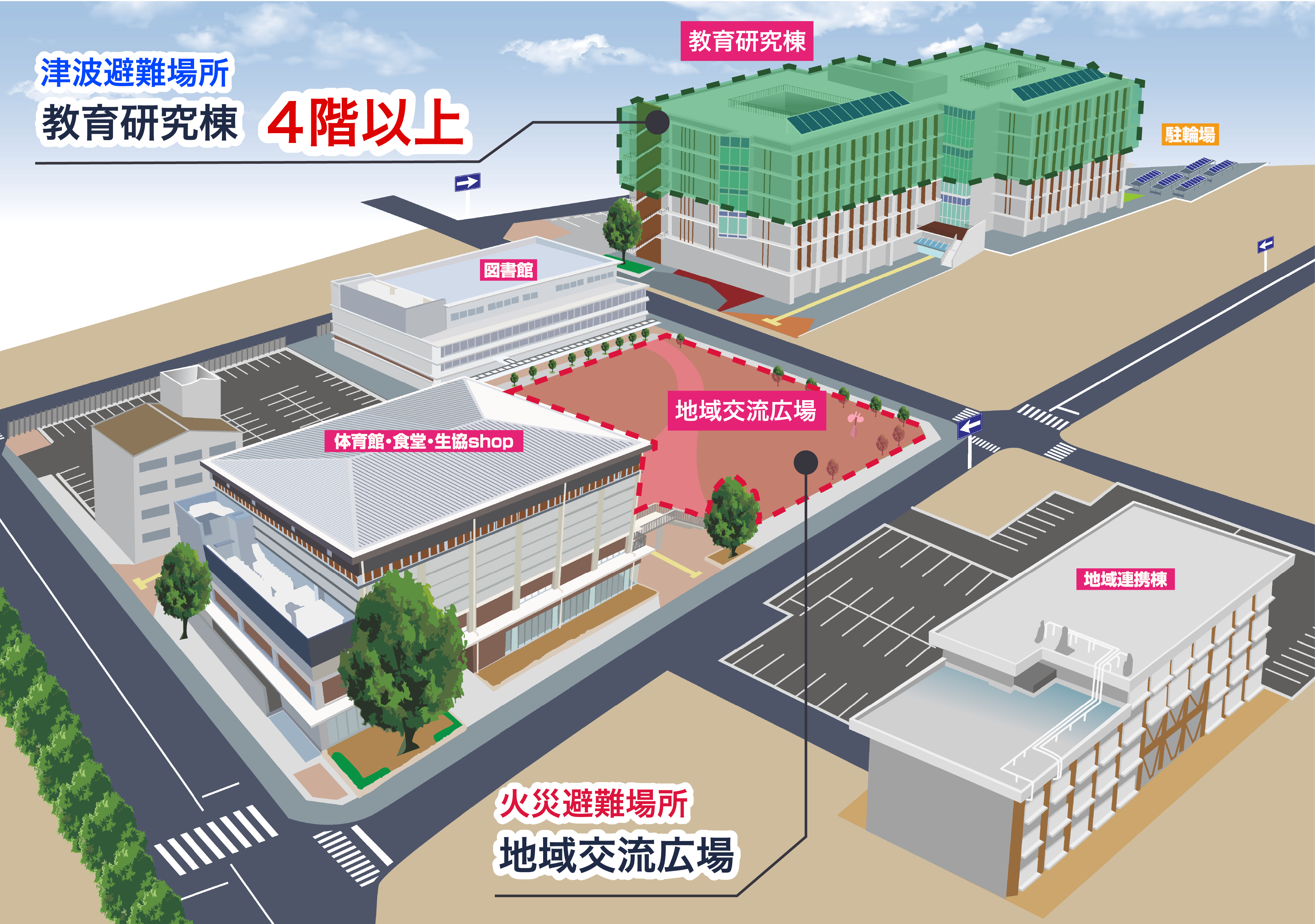 池キャンパスは棟ごとに一時避難場所の階が異なります。