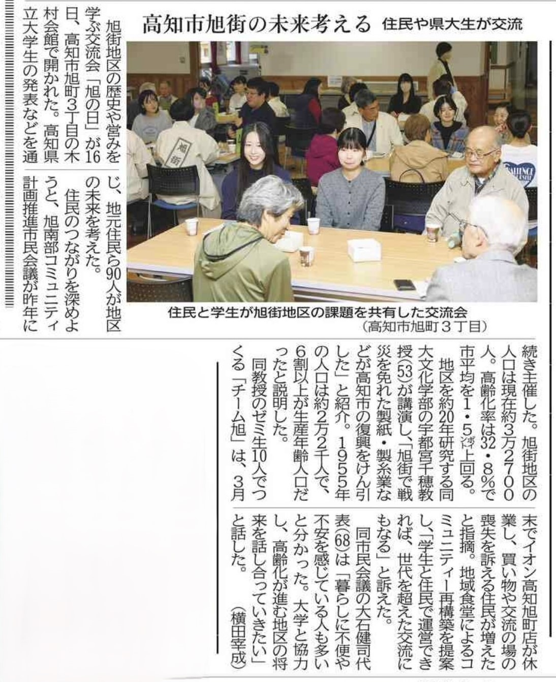 2025年度の宇都宮ゼミナール(地域政策研究室)では、イオン高知旭町店閉店がもたらす地域への影響を調査し、政策アイデアを作成しています。その内容を2025年11月16日(日曜日)に開催された「旭の日」(旭南部コミュニティ計画推進市民会議主催)で発表させていただきました。会場となった木村会館には多くの方が足を運んでくださり、発表内容について、たくさんのご意見やご感想をいただきました。また、発表会のあとに開催された交流会では、学生と地域の方がテーブルを囲み、旭をテーマにさまざまな話題で盛り上がりました。