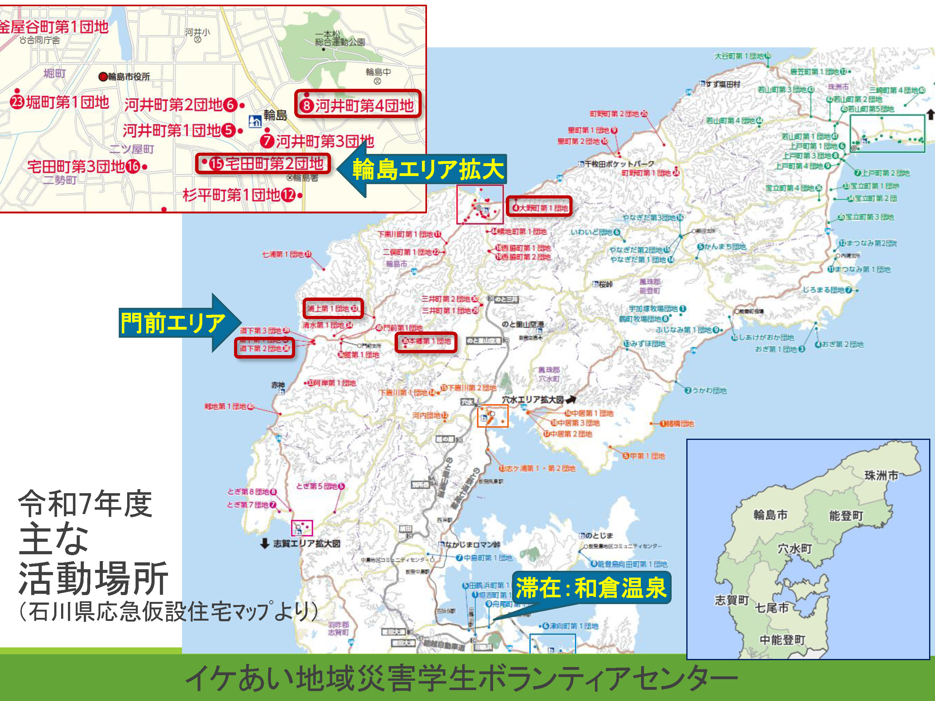 なお、本活動にあたり、大学後援会様、同窓会しらさぎ会様より活動費のご支援をいただきました。また現地活動にあたっては、輪島市支援調整窓口(一般社団法人 ピースボート災害支援センター)様、公益社団法人 青年海外協力協会 様のご協力をいただきました。厚く御礼申し上げます。