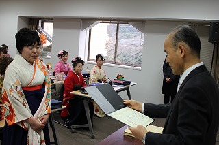 卒業式終了後、社会福祉学部教員とともに写真を撮影しました。その後、社会福祉学部は場所を移し、前山学部長から一人ひとりに卒業証書が手渡されました。そして、社会福祉士の実習、精神保健福祉士の実習で優れた成績を修めた卒業生や、ボランティア活動を行い、顕著な事績を収めた卒業生に対して表彰を行いました。式典が終了すると、色とりどりの袴をはいた卒業生たちは、学生生活最後の記念にと写真を撮り合っていました。卒業生34名は、それぞれの道を歩み出しました。