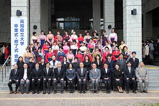 2012年3月19日(月)に社会福祉学部第11期生を含む平成23年度高知県立大学の卒業式が、高知県立県民文化ホールにて行われました。今年は高知県立大学として初めての卒業式となりました。式では、全卒業生のうち唯一、社会福祉学部の田所麻衣子さんが成績や研究、社会貢献活動などの成果が特に優れているとして、南裕子学長より大学賞を授与されました。