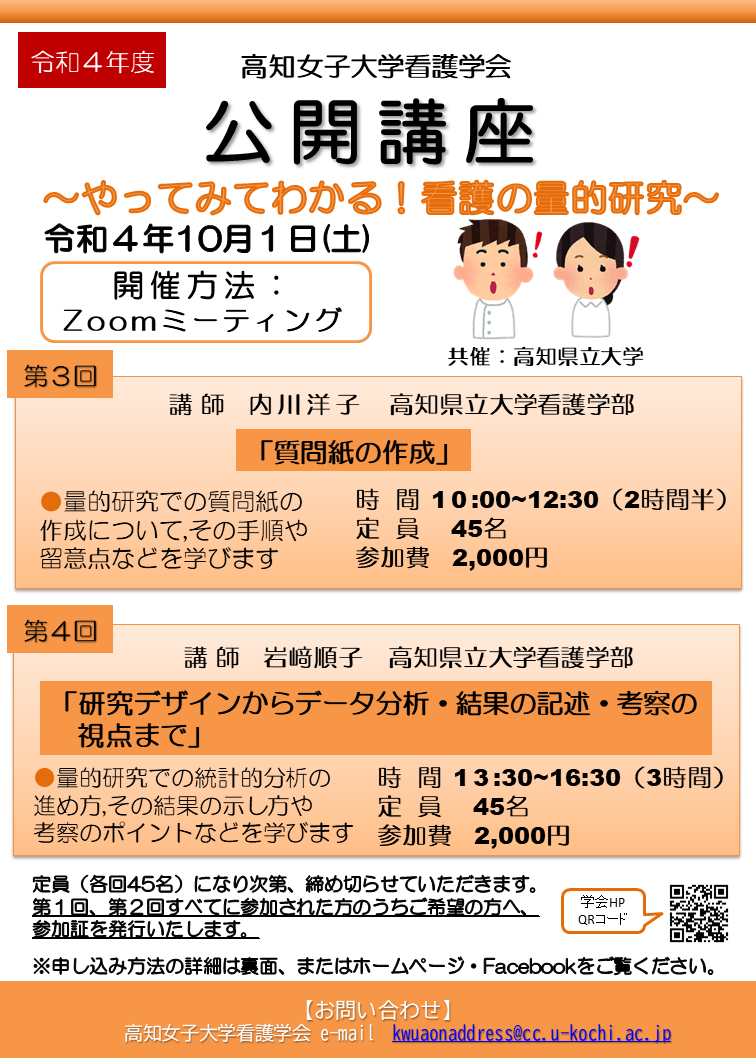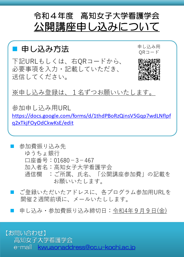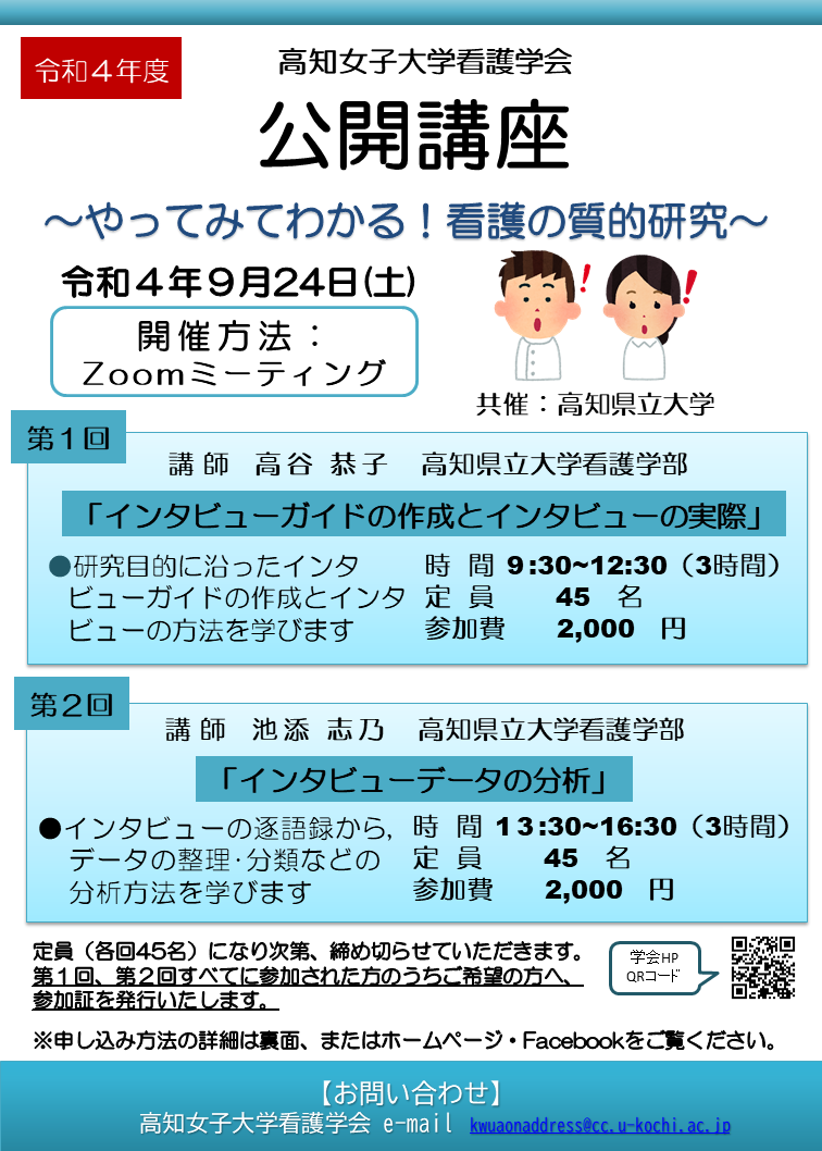 - 高知女子大学看護学会 公開講座が8月30日(土)、9月20日(土)に開催されます!!