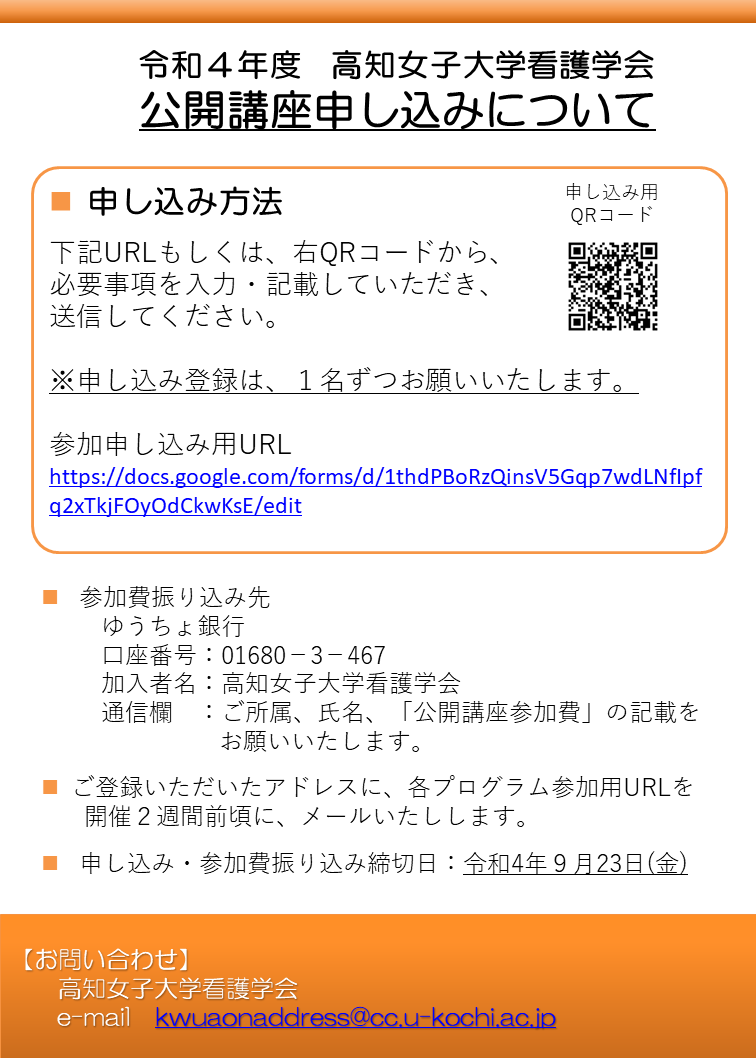 - 高知女子大学看護学会 公開講座が8月30日(土)、9月20日(土)に開催されます!!